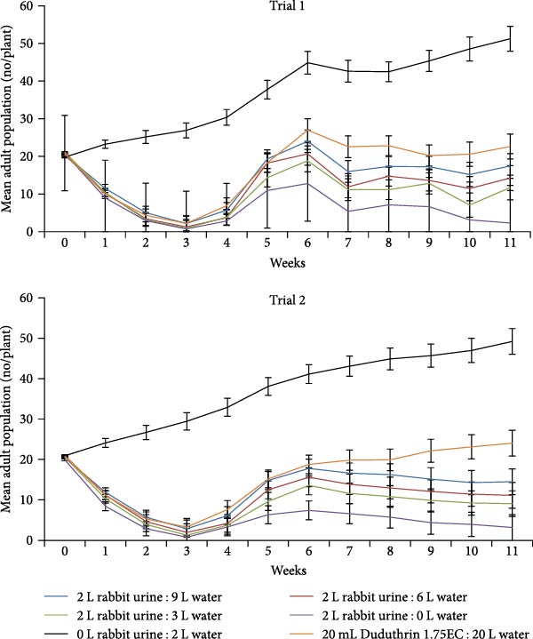 The use of rabbit urine foliar spray also significantly influenced the population of whitefly nymphs (Figure 2). In most sampling weeks of both trials, treatment 0 L rabbit urine : 2 L water (negative control) registered significantly () higher populations of whitefly nymphs than all other treatments. Pure rabbit urine (2 L rabbit urine : 0 L water) registered the lowest whitefly nymph population (12.96 in trial 1 and 13.13 in trial 2). In both trials, the populations of whitefly nymphs in treatments 2 L rabbit urine : 6 L water, 2 L rabbit urine : 3 L water, and 2 L rabbit urine : 0 L water (pure rabbit urine) decreased with time. This was contrary to the trend shown in 0 L rabbit urine : 2 L water and 20 mL Duduthrin 1.75 EC : 20 L water. The population of nymphs in treatment 2 L rabbit urine : 9 L water remained fairly constant in the first trial but exhibited a decreasing trend over time in the second trial. Among the different concentrations of rabbit urine, the whitefly nymph population decreased with an increase in the concentration of rabbit urine in all sampling weeks of both trials. In both trials, nymph populations in treatment 20 mL Duduthrin 1.75EC : 20 L water were significantly () higher than those in 2 L rabbit urine : 6 L water and pure rabbit urine treated plots.