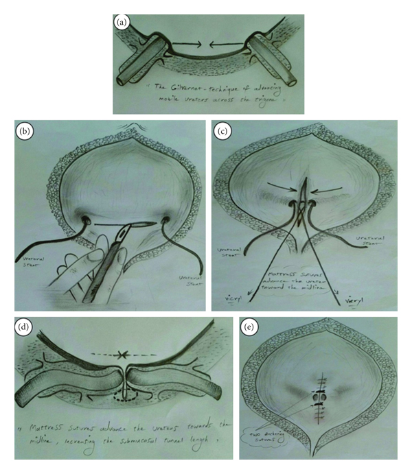 Summarily, Gil-Vernet antireflux technique in contrast with Politano-Leadbetter technique is less invasive, with lower possibility of damage to adjacent organs and bilaterally operable simultaneously. Also in contrary to Cohen technique, there is no likelihood of ureteral angulation, and ureteral orifices are closer to their natural site which results in the easier retrograde catheterization and ureteroscopy in the future, and unlike the Glenn-Anderson technique, in the present technique, by less manipulation of trigone and less ureteral mobilization, the limitations of favorable submucosal ureter length creation are not present. Overall present technique is much easier than other one. Our experience indicates that the modified Gil-Vernet antireflux surgery is a very simple, safe, rapid, and highly successful procedure. We believe in its efficacy for high-grade VUR correction and thus suggest its application by other surgeon colleagues.