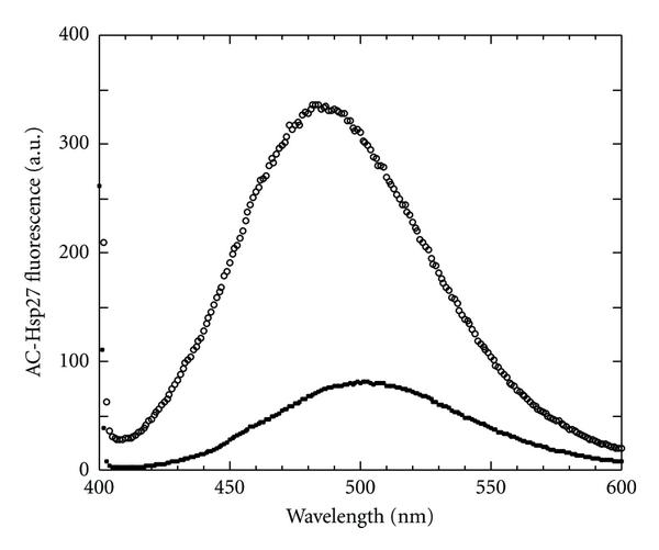 Acrylodan is very sensitive to its environment [33] and, when attached to a protein, often sensitive to protein-protein interaction. As shown in Figure 2, acrylodan-Hsp27 is very sensitive to the binding to F-actin. In the presence of actin the fluorescence intensity increased about 4-5-fold and the emission spectrum was blue-shifted about 20 nm (Figure 2), changes indicative of greater probe shielding from the solvent upon interaction with actin.