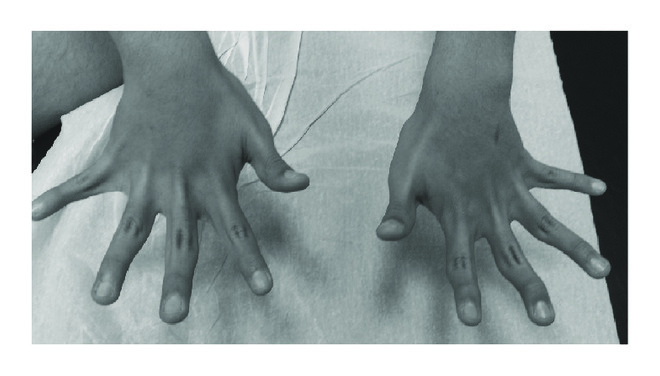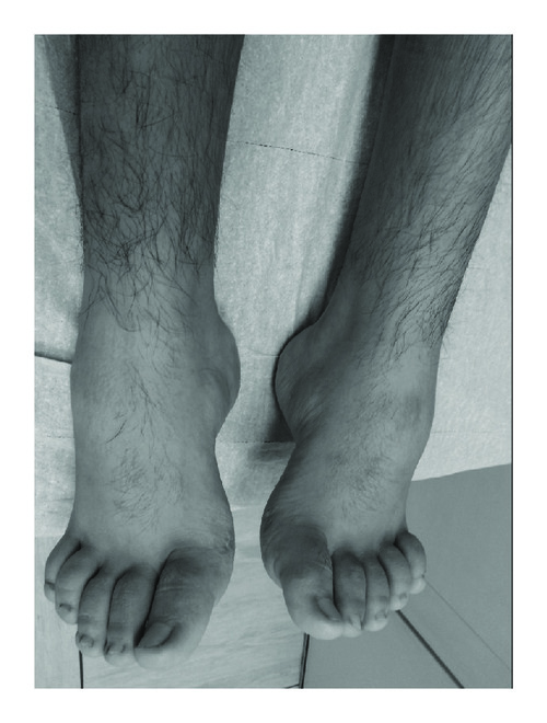 Musculoskeletal examination showed deformity in his right elbow with joint mobility restriction (flexion of 115°, extension of −15°) and periarticular muscular hypotrophy related to posthaemarthrosis arthropathy. The other joints were functioning and had a Haemophilia Joint Health Score (HJHS) of 10. Neurological examination showed normal cognition, general hypotonia, strength maintained, exaggerated tendon reflexes, positive Babinski reflex, pes cavus, and more distally marked muscular hypotrophy (Figures 1 and 2). Steppage gait with varus support showed that he was not able to jump or stand on one foot; he went upstairs with support and without alternating both feet. Given that the symptoms were not justified by his factor VII deficiency and on suspicion of HSP, his parents and sister were examined.