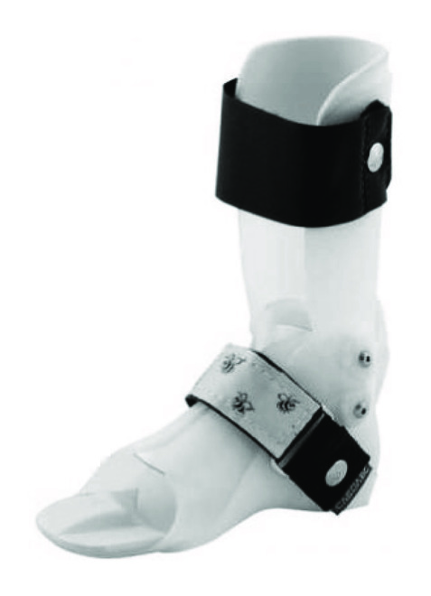 Following primary assessment prophylaxis was initiated with rFVIIa at 30 mcg/kg, a total 1.5 mg dose (older brother), and 0.5 mg dose (younger sister), three days per week (Monday-Wednesday-Friday). A rehabilitation programme was prescribed which aimed at maintaining functional independence for the longest possible time, based on physiotherapy (inhibitory techniques of spasticity, polyarticular assisted kinesiotherapy, progressive muscular strengthening, proprioception, and balance and coordination) and occupational therapy (fist and grip strength, bimanual dexterity, gestural readaptation, reeducation of activities of daily living, and compensatory manoeuvres). It was also necessary to prescribe a DAFO (dynamic ankle foot orthosis) to the older brother to control his pes cavus-varus (Figure 3). Response to treatment is satisfactory at present and there has been no further presentation of bleeding. Both patients are currently being monitored by the haematology, rehabilitation, and neuropaediatric departments.