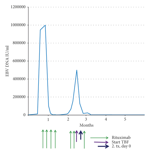 Although initially effective, he failed first-line treatment of PTLD with rituximab as the PTLD rapidly relapsed. In this situation, the prognosis was dismal and therapeutic options were few. Third-party EBV-specific T cells were considered, but these were not readily available at our center. To complicate matters, the patient also had graft failure and needed a new transplantation.