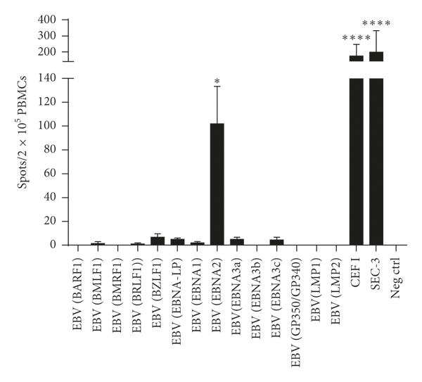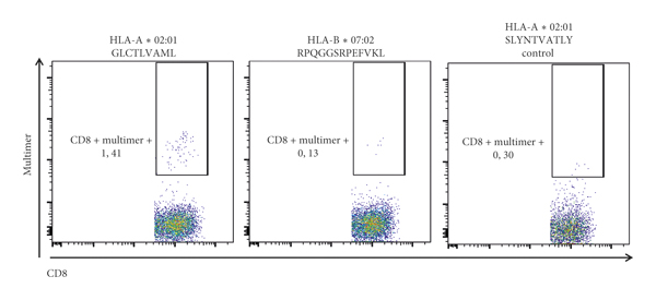 At day +22, peripheral blood was drawn and analyzed by flow cytometry for the detection of EBV-specific T cells (Figure 2). Both donor and patient were HLA-A02:01 and HLA-B07:02 positive. A population of CD8+ T cells was found to bind an HLA-A02:01 epitope from the EBV lytic protein BMLF1, whereas no cells recognizing the HLA-B07:02 epitope from the same protein could be detected. Additionally, peripheral blood mononuclear cells were tested ex vivo for production of interferon-gamma (IFN-γ) in response to stimulation with an EBV peptide library (Figure 3). There was a very dominant response against the EBNA2 peptide pool. This was the only significant response detected, but weaker responses against several peptide pools from other proteins could also be detected.