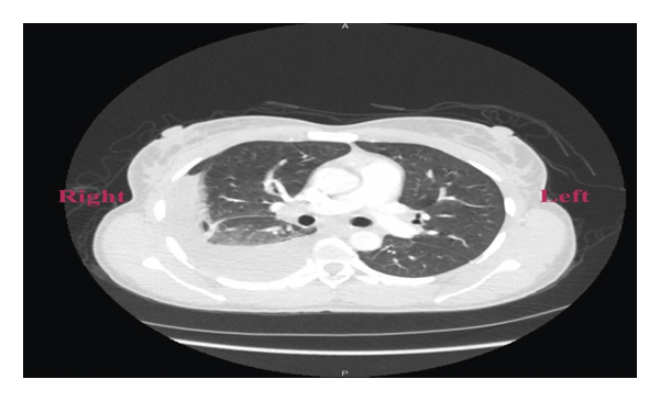 A 38-year-old Liberian female with a 12-week gestation presented to the emergency department with a 3-week history of low-grade subjective fever, night sweats, unintentional weight loss, gradually worsening abdominal pain, and intermittent spotting. Vital signs were stable on presentation, physical exam noticeable for gravida abdomen, otherwise unremarkable. Laboratory examination revealed beta hCG 118471, which was otherwise unremarkable. Pelvic ultrasound confirmed a 12-week viable intrauterine pregnancy. The patient was admitted to the hospital for close monitoring. Hospital course was complicated by massive pleural effusion, low-grade fever, progressive worsening abdominal pain, and spontaneous abortion. Non-contrast-enhanced computed tomography of the chest (Figure 1) revealed large right-sided pleural effusion, and contrast-enhanced computed tomography of the abdomen and pelvis (Figure 2) revealed bilateral hilar adenopathy, ascites, thickening and enhancement of the peritoneum, and mottled nodular-appearing soft tissue consistent with omental caking suspicious for peritoneal carcinomatosis. She underwent extensive workup including surgical and oncologist consultations for possible exploratory laparotomy and discussion of treatment options for presumed ovarian neoplasm. Blood work revealed elevated carbohydrate antigen (CA) 125 and positive QuantiFERON-TB Gold, but adenosine deaminase, CA 19, alpha-fetoprotein, and inhibin B were within normal limits. Diagnostic laparoscopy with biopsy revealed significant pelvis ascites and diffuse miliary lesions throughout the peritoneum. She underwent dilatation and curettage; histopathologic examination showed chronic granulomatous inflammation with no evidence of neoplasm. Special stains on tissue sections and ascitic fluid stain revealed rare acid-fast bacilli, suggestive of mycobacterial granulomatous peritonitis. Additional questioning indicated a history of positive PPD skin test a year prior without follow-up treatment. The patient was placed on four-drug anti-tuberculous therapy and had a complete recovery.
