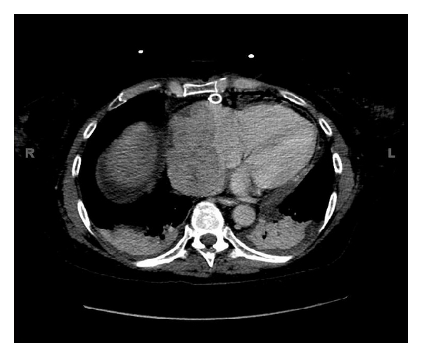 Thirteen years after the allograft, she complained of shortness of breath and dyspnea on exertion. She denied any chest pain and any palpitations. The patient was put on albuterol, but continued to have shortness of breath. An echocardiogram in her family physician’s office indicated the presence of a “large right atrial thrombus”, and she was immediately referred to the hospital emergency department. A venous ultrasound of the right and left lower extremities showed no evidence of venous thrombosis. Imaging studies ruled out pneumothorax and/or pulmonary embolism. Echocardiogram documented a normal ejection fraction (60–65%); however, a mass measuring 6.7 × 3.3 cm was seen in the right atrium encroaching the right atrial wall and a large pericardial effusion with tamponade. CT confirmed a large right cardiac atrial mass, extending into the inferior vena cava and also involving the superior vena cava as it enters the atrium and the pericardial effusion (Figure 1). The patient then underwent a pericardial window to drain the pericardial effusion. The effusion cytology showed that 50% of the cells were plasma cells, which was confirmed by immunoperoxidase CD138 positive staining. In situ hybridization stains for kappa and lambda chains indicated that almost all of the plasma cells were positive for lambda light chains. The diagnosis of monoclonal plasmacytosis was made. Biopsy of the pericardial tissue ruled out other malignancies, amyloidosis, and vasculitis.
