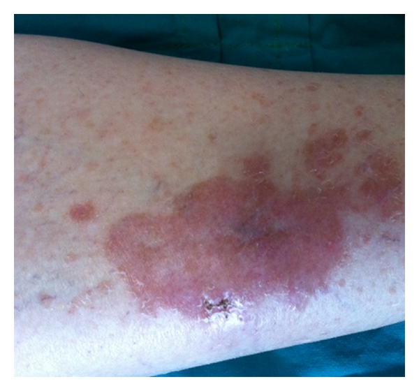 We present 52-year-old woman, who did not seek medical care for complaints that continued for six years and suggested Raynaud’s phenomenon in the finger joints of the hands. One year ago, brown-red skin lesions developed at the pretibial part of the right foot and the patient consulted a dermatologist. However, the patient did not receive any results from the dermatological examination and visited our rheumatology polyclinic after arthralgia, morning stiffness, and effort dyspnoea started together with the Raynaud’s complaints. Upon a physical examination, telangiectasia on the face, lessening of the mouth opening, sclerodactilia and Raynaud’s phenomenon pallor phase of the fingers, and a brown-red skin lesion of approximately 15 cm on the right foot pretibial site not protruding from the skin were found Figure 1. In the auscultation of the lungs, crepitant rales were determined on both lungs. On laboratory examinations, the erythrocyte sedimentation rate was determined to be 38 mm/h (normal <20 mm/h) and the C-reactive protein levels to be 3.5 mg/dL (normal 0–0.5 mg/dL), and the rheumatoid factor (RF) was negative. Liver and kidney function tests were normal. A routine urinalysis was performed and was found to be normal. On serological examination, the antinuclear antibody (ANA): 1/320 nucleolar and homogenous pattern anti-Scl70 antibody were positive. The complement components C3 and C4 were normal, whereas anti-CCP, anti-Ro, Anti-La, anti-Sm, and anti-ribosomal P antibodies were determined to be negative. Serum angiotensin converting enzyme (ACE) level was 65 U/L (normal: 8–52 U/L), serum calcium level was 10.2 mg/dL (normal: <9.8 mg/dL), and the serum hidroxy-D3 was normal. On the lung graphy, a thin reticular pattern was observed. On the thorax HRCT, ground glass opacification in line with interstitial lung disease and honeycomb appearance was observed. As a result, a thoracic diseases specialist was consulted. A bronchoscopy and BAL were performed and mixed (neutrophilic and lymphocytic) alveolitis was found. A skin biopsy was taken and the noncaseating granulomatous structure of the skin was consistent with granulomatous dermatitis, sarcoidal type. No acid-fast bacilli in the Ziehl-Neelsen histochemistry and fungus in the PAS histochemistry were observed. Structure consistent with leishmania was not determined in the Giemsa histochemistry. Tissue samples examined with PCR did not exhibit acid resistant bacilli (ARB). Based on the clinical, laboratory, and histological outcomes, the patient was diagnosed with sarcoidosis and SS. Corticosteroid 16 mg/day, Hydroxychloroquine 200 mg/day, and Azathioprine 150 mg/day were initialized. During the follow-up visits, the effort dyspnoea of the patient decreased and a significant improvement in the functional lung study (spirometry and DLCO) and in the skin lesions was observed. At six months, a decrease in active alveolitis lesions was observed on the control thorax HRCT and the chronic lesions were reported to remain stable. Regular patient follow-up continues.
