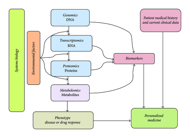Systems biology is the study of the biochemical, molecular, and supramolecular networks, along with their connections and interactions with the environmental factors in order to investigate an intricate biological perturbation of the living organism [123]. This term is an integrative approach which investigates not only the biological “Omics” such as genomics, transcriptomics, proteomics, and metabolomics, but also the environmental factors such as nutrition, gut microbiota, infections, other drugs, disease state, rest, and sleep which interfere with them. In fact, the conventional biology describes the biological processes in the living system without considering the connections and interactions between them and their environment; however, systems biology is comprehensive in terms of explaining the biological processes, their pathways networks, and other environmental factors which all together contribute to a phenotype such as disease or clinical trait [124, 125]. This will give an extensive understanding of that phenotype by using the multidisciplinary “Omics” data as biomarkers of the phenotype [125]. While the study of the genes and their association with the phenotype is the main interest of genomics, the study of the messenger ribonucleic acid (mRNA) and transcription process is the aim of transcriptomics [126]. The proteomics focuses on peptides and proteins expression [127]. Eventually, as all the substrates in the organism will be subjected to metabolism, the metabolomics focuses on the study of the metabolites [128]. The role of systems biology in the prediction of the phenotype and the personalization of therapy is shown in Figure 2.