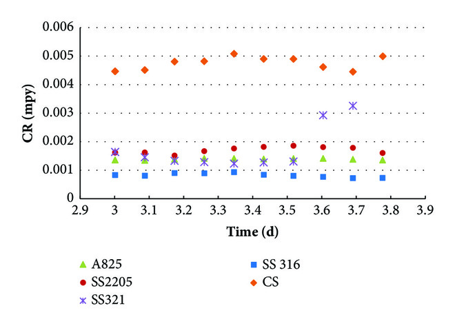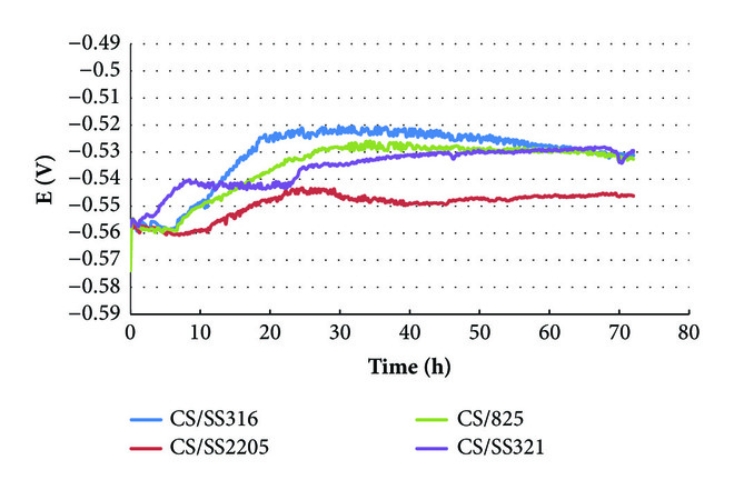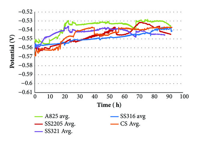Alloys under study (SS 316, SS 2205, 825, and SS321) were coupled with CS in separate experiments in stagnant, deaerated 3.5% ABS at 60°C. The experiments were conducted in triplicate for accuracy. For each couple, potential (E) versus time was measured till the quasi-steady state was reached, and current (I) versus time was measured using a ZRA. For each couple, the average results of E versus time were calculated. Then, the average potential values for all galvanic couples were plotted in a comparative graph (Figure 5).