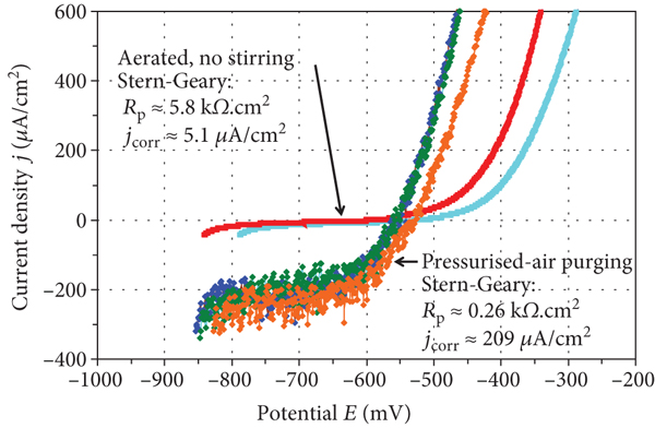 Figure 16 depicts the influence of different aeration on the course of voltammetric measurements and the Stern-Geary corrosion data as well. Under pressurised-air purging, the ocp is shifted in the positive direction, and the cathodic currents are favoured in accordance with the mixed potential theory. The control of the corrosion rate at ocp is more on the side of the cathodic partial reaction, because the oxygen reduction takes place under a high degree of transport control, where the diffusion layer thickness is substantially decreased for the vigorously moved electrolyte solution. It is easily conceivable that the corresponding curves are subject of higher scattering due to the less controlled air purging. The outlined situation is reflected also by the mean values of the polarisation resistance and the corrosion current density , which surpass for pressurised-air conditions those for the unstirred state by a factor of about 40 (Figure 16, inserts).