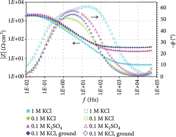 A second impedance diagram (Figure 19) addresses different solution compositions. These curves provide evidence that a concentration modification from 1 to 0.1 mol/L KCl does not give significant change in the LF plateau. A similar result, within the normal scatter, is gained, when the chloride is completely removed using the sulphate salt of the same molar concentration. This means that the overall corrosion rate will not be essentially influenced by the actual concentration or even by the absence of chloride anions. The negligible chloride influence may be regarded as unexpected, because it is well known that the chloride ion is involved in the anodic dissolution mechanism [46]. However, earlier experiments using AISI 4340 low-alloyed steel in neutral sulphate and chloride solutions [47] gave similar results. Further, a relatively low concentration dependence of corrosion current densities was observed in polarisation measurements on SAE 1010 carbon steel in aerated 0.02-1 M NaCl solutions [44, 48]. This was explained by the fact that both partial reactions—the cathodic partial reaction with mixed control of charge-transfer and mass transport and the anodic subprocess with pure charge-transfer control—undergo a concentration influence.