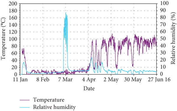Figure 4 addresses a second point of interest, namely the relation between temperature and humidity, as determined by the special sensor(s) set in the preheater mantle. On the very left-hand side of the diagram, the high temperature signalises the last phase of the operating state in January 2016 before the onset of shut-down, which is usually planned for wintertime. It may be seen that along with the decrease of temperature also the humidity decreases. Correspondingly, the temperature movements after onset of operation in the beginning of April 2016—three raises and three short-time interruptions—are associated with in-phase movements of the relative humidity, i.e., a maximum of the relative humidity occurred when a temperature maximum was observed and vice versa. After some time, the humidity changes diminish in their amplitudes, although temperature minima keep linked with those of the relative humidity until the end of the records.