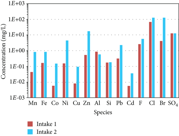 Samples M18/1 and M24/1 from intake 1 were characterised by a higher noncrystalline fraction on the outer surface associated with minute Cl contents smaller than that for samples from intake 2 (Figures 8(g) and 8(h)). This agrees with the contamination results shown in Figure 9.