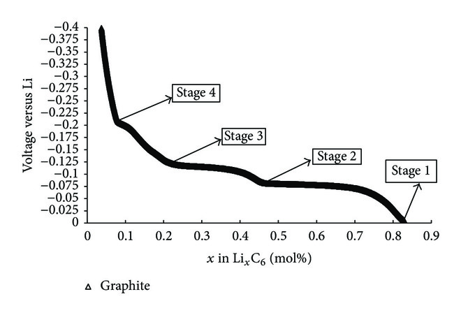 Graphite has been the material of choice for the anode electrode in all commercial devices. A typical four-stage lithium intercalation curve in graphite material is well known in the literature (Figure 1).