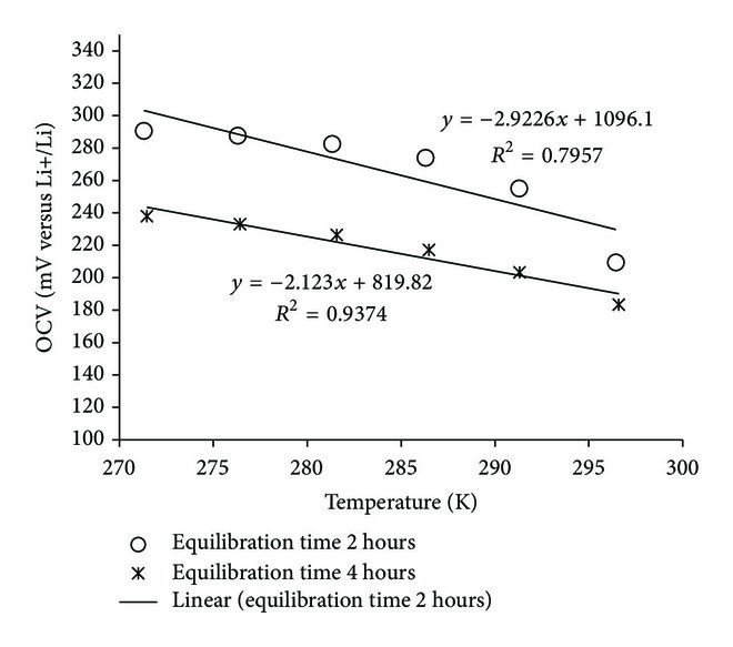 Experiments were performed to find the correct equilibration time. A minimum equilibration time is necessary to achieve a steady equilibrium among all the components of the cell at the given temperature and voltage and thus to obtain accurate data on the thermodynamic parameters. According to literature [13], 10 minutes’ equilibrium time was sufficient and the OCV varied linearly with change in temperature at that equilibration time. We found that this does not hold true in our investigation and had to conduct a set of experiments to investigate the equilibration time. It is well known that linear change occurs in OCV with temperature as long as there is no phase change occurring in the system during intercalation [12]. Figure 2 shows the experimental data for ROHG at 2-hour and 4-hour equilibration time. The cell equilibrated at 4-hour time showed value of 0.93 versus 0.79 for cells with 2-hour equilibration time. It is thus clear that at least 4-hour equilibration time is necessary to obtain good data. Four hours was thus chosen as the equilibration time for further studies.
