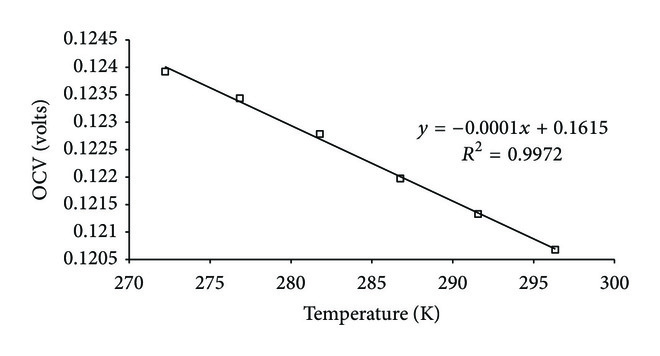 The OCV versus temperature plot yielded a linear relationship and from the slope of the line was calculated. The change in the voltage with temperature was used to calculate the entropy and enthalpy using (2) and (3), respectively.