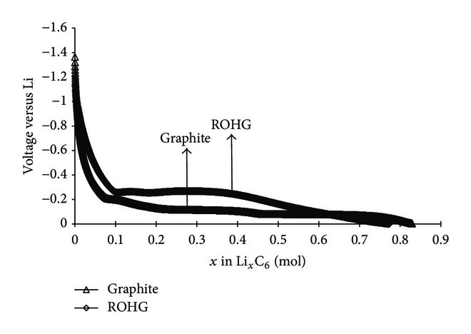 Clearly, there is a difference in the lithium intercalation mechanism between ROHG and graphite as seen from Figure 4. Unlike graphite [8–10], only two stages are seen with the ROHG. Initially the voltage drops from starting OCV (−2.9 V) to −0.256 V and held at about that voltage as the plateau shows. At this stage, the Li-C stoichiometry is Li0.188C6. The second stage shows a continuous drop from −0.254 V to 0 V with a stoichiometry Li0.78C6. The different features associated with progression in lithium intercalation in the concentration versus voltage plot indicate that different lithium compounds are present in ROHG compared to graphite.