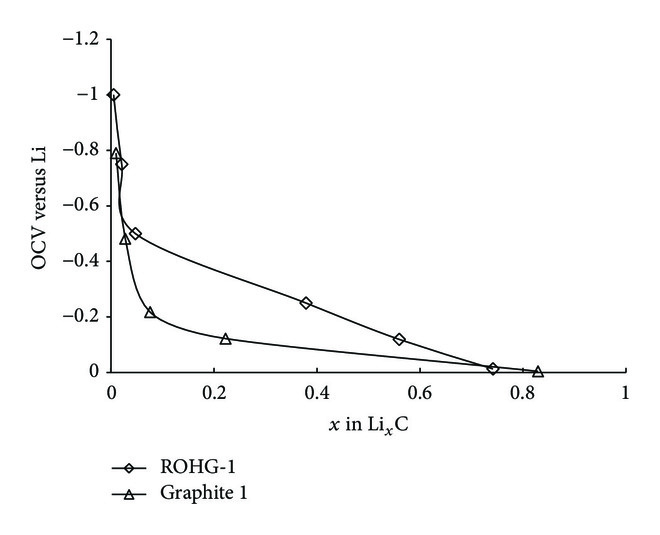 The equilibrium OCV is the potential difference between the two electrodes, that is, graphite or ROHG versus the lithium metal foil. Tables 1 and 2 show the relationship of OCVs and mole fraction of lithium in ROHG and graphite at 296°K, respectively. The OCV depends on the chemical environment where the lithium resides in the carbon structure on an atomic level. The half cells with ROHG carbon and graphite show similar trends in OCV with increase in lithium concentration/mole fraction (Figure 5). However, the change in the OCV is more gradual in the case of the ROHG carbon compared to the graphite after the initial OCV change at low concentration. This suggests that, unlike graphite, there is continuous change in the chemical environment in the ROHG carbon almost to the end compared to graphite, which shows smaller change in the OCV with lithium intercalation after the initial change associated with lithium incorporation. This difference indicates that the mechanisms of lithium incorporation in ROHG and graphite are different.