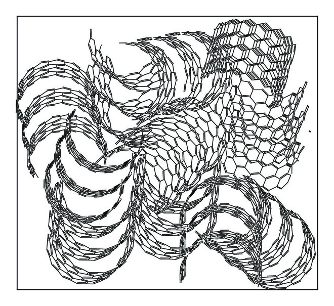 A Monte Carlo simulation was done in-house to predict the structure of the ROHG carbon. From the simulation, the ROHG carbon consists of cluster of convoluted and randomly oriented graphene platelets at high concentration as shown in Figure 7 and therefore the carbon is called “Randomly Oriented High Graphene” (ROHG) carbon.