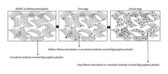 Based on the observations made from the intercalation curves (Figure 4), OCV curves versus lithium mole fraction (Figure 5), entropy (Figure 6), enthalpy (Figure 6), and Monte Carlo model (Figure 7), a model is proposed for lithium intercalation in the structure of ROHG as shown in Figure 8. The lithium insertion takes place in between the cluster of convoluted and randomly oriented graphene platelets. The distance between the graphene platelets in ROHG is larger compared to graphene platelets in graphite which support fast lithium intercalation and deintercalation in the structure of the carbon. During the first stage, lithium is beginning to get intercalated in the platelet structure of ROHG as shown in Figure 8. Further intercalation allows the insertion of lithium deeper in the convoluted platelets.