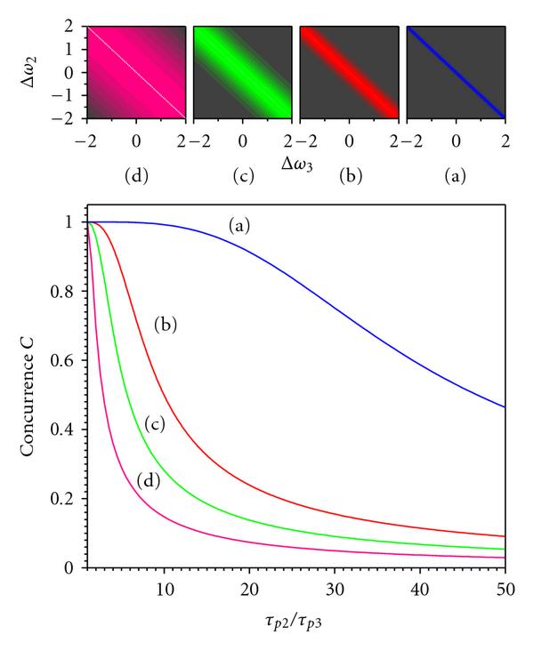 We first examine how the degree of the entanglement of the down-converted photons depends on the spectral bandwidth of the pump photons, In Figure 1, on the inset, we have shown the square of the magnitude of the Gaussian spectral profile of the pump photons [] for different values of the pump bandwidth, (blue [a]) (red [b]) (green [c]), and (pink [d]) respectively For each of these values of spectral bandwidth the concurrence in (12) along with corresponding normalization factors 's in (11) is calculated as a function of crystal transit time difference between the pump and the down-converted photons, and . The colored curves shown in Figure 1 is the result for the corresponding concurrence, , as function of . These curves labeled as (a), (b), (c), and (d) show how the concurrence is affected as we vary when the pump photons bandwidth is [blue (a)] [red (b)] [green (c)], and [pink (d)] respectively. Comparing these curves with the corresponding pump photons spectral profile, we note that as the pump bandwidth becomes narrower, the effect of the difference in crystal transit time on the entanglement of the two photons becomes negligible. This means that the optical anisotropy of the crystal which causes the difference in crystal transit times has no significant effect on the entanglement when the incident pump photons have a negligible bandwidth. On the other hand, as the pump spectral profile becomes broader, the effect of optical anisotropy of the crystal becomes significant. We observe this behavior for the entanglement in Figure 1 where the concurrence becomes less than unity, rapidly, as the pump becomes broader and However, when the two down-converted photons have the same crystal transit time which means that the crystal is optically isotropic. Under this condition, independent of the spectral bandwidth of the pump photons, the entanglement remains maximal, .