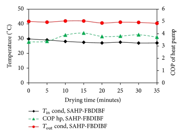 The variations of temperature at inlet and outlet of condenser and COP of the heat pump with drying time for SAHP-FBDIBF are shown in Figure 11. The temperature at inlet and outlet of the condenser ranged from 27.0°C to 29.8°C and 40.4°C to 42.0°C, with average values of 27.9°C and 41.3°C, respectively, whereas the COP of the heat pump was calculated in the range of 3.33–4.06, with an average value of 3.74, respectively, under an air mass flow rate of 0.10369 kgs−1.