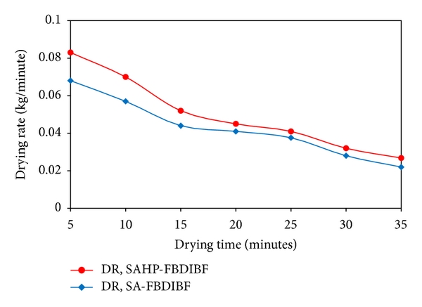 The variations of drying rate with drying time for SAHP-FBDIBF and SA-FBDIBF are shown in Figure 17. The drying rate of paddy was calculated in the range of 0.022 kg/minute–0.068 kg/minute and 0.027 kg/minute–0.083 kg/minute, with average values of 0.043 kg/minute and 0.050 kg/minute for SA-FBDIBF and SAHP-FBDIBF, respectively. As seen from Figure 17 the drying rate decreased with increase in drying time. This, due to the evaporation rate of moisture, decreased in the drying time.