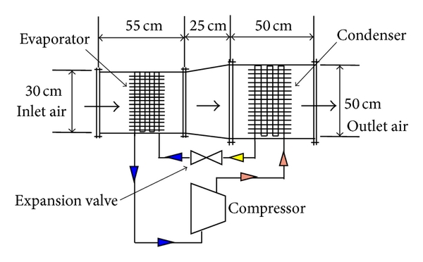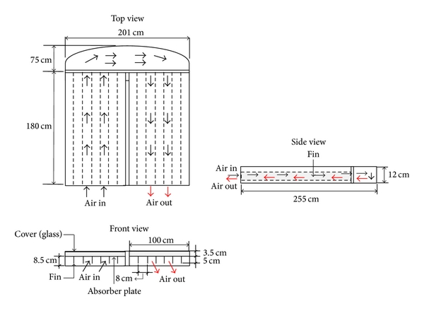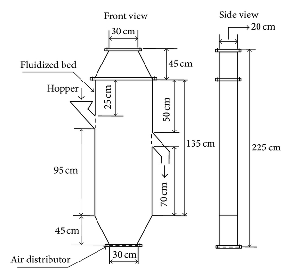 A solar assisted heat pump fluidized bed dryer integrated biomass furnace was designed and installed at the Institute of Technology, Padang, West Sumatra, Indonesia. The drying system consists of finned single-pass solar collector, heat pump, biomass furnace, fluidized bed, cyclone, and blower as shown in Figure 1. The solar collector equipped with transparent cover glass material, absorber plate finned used aluminum and black painted opaque, angle iron frame, inside and outside the collector coated with aluminum 1 mm thickness, and insulation using glass fiber materials. Two solar collectors are connected in series with an area of 1.8 m2 each, shown in Figure 2. The heat pump consists of several main parts: evaporator, condenser, compressor, and expansion valve. The working fluid of the heat pump is R-22. Compressor use of electrical capacity is 0.5 HP. The dimension of evaporator and condenser of the heat pump is shown in Figure 3. The biomass furnace consists of several main parts such as the combustion chamber, heat exchanger, chimney, and blower. The wall of the combustion chamber uses brick, cement, and steel plate materials and heat exchanger pipes using mild steel with diameter of 2 inc and the number of pipes is 16 units, in which dimension of biomass furnace is shown in Figure 4. The fluidized bed consists of several main parts such as drying chamber, air flow distribution, and the inlet and exit of paddy. The front part of the drying chamber is covered with clear glass with a thickness of 5 mm, and the sides and back are covered with 3 mm thick aluminum plate, while the air distributor used wire aluminum gauze and dimensions as shown in Figure 5. Cyclone is covered with aluminum plate with 3 mm thickness, and its dimensions are shown in Figure 6. The drying air was circulated by using centrifugal blower (BFD) with 3.7 kW power (three phases).