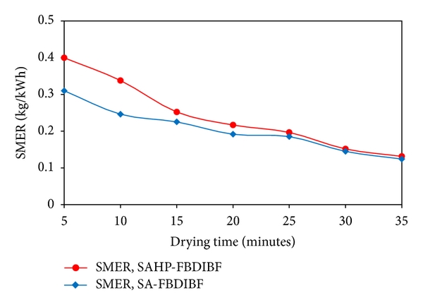 Specific moisture extraction rate (SMER) is ratio of the moisture evaporated from wet product to the energy input to drying system. The specific moisture extraction rates of the SA-FBDIBF and the SAHP-FBDIBF were calculated using the following equations [24]. The SMER for the SA-FBDIBF: The SMER for the SAHP-FBDIBF: where is the electrical energy consumed by blower of fluidized bed and is the electrical energy consumed by blower of cyclone.