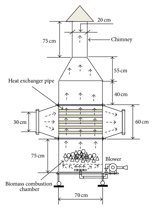 The thermal efficiency of a biomass furnace is the ratio of useful heat by biomass furnace to the heat energy generated by the combustion of the biomass fuel. It was calculated using the following equation [32]:where and are the inlet and outlet air temperatures of biomass furnace, respectively, is biomass fuel consumption rate, and is caloric value of biomass fuel. The biomass fuel uses coconut shell charcoal with a caloric value of about 7600 kcal/kg [33].