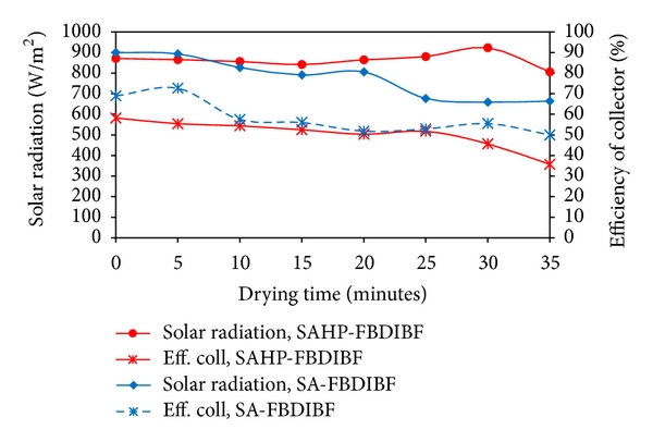 The performance of drying system is satisfactorily depending on the performance of each of the drying system components such as solar collector, heat pump, and biomass furnace. The thermal efficiency of a solar collector is the ratio of useful heat gain by solar collector to the energy incident in the plane of the collector. It was calculated using the following equation [30]:where is air mass flow rate, is specific heat of air, and and are inlet and outlet air temperatures of solar collector, respectively. is an area of collector and is solar radiation incident in the collector.