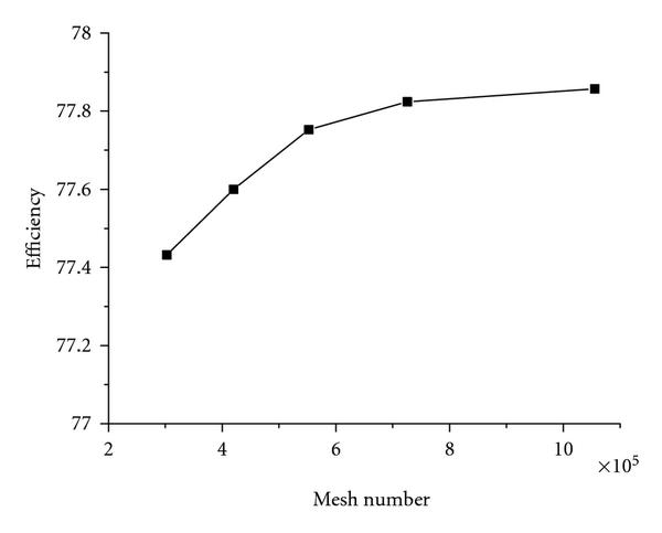 ICEM-CFD was used to generate structured hexahedral grid for each component part. Denton and Daws [6] have observed that 300,000 nodes are required for adequate representation of viscous effects with shock waves and tip leakage, but also noted that useful comparisons can be made with 100,000 nodes. Miner’s published work [7] and Spence and Amaral-Teixeira [8] indicate that relatively coarse impeller models (20,000–40,000 nodes) can be used to predict performance with some accuracy. Denton has also observed that the 22,000 grid per blade passage is sufficient for a calculation with approximate allowance for viscous effects. A grid independent study of this pump was performed, Figure 2 shows the variation of efficiency with mesh number, as could be seen that the variation of efficiency was within 0.5% as mesh numbers ranged from 500,000 to 100,000. The final mesh number of inlet pipe, impeller, front chamber, back chamber, and volute is 98 312, 295 240, 84 835, 61 628, and 375 626, respectively, and the total number of mesh is 915641. For other model’s simulation, only the volute was changed and the mesh numbers were almost the same.