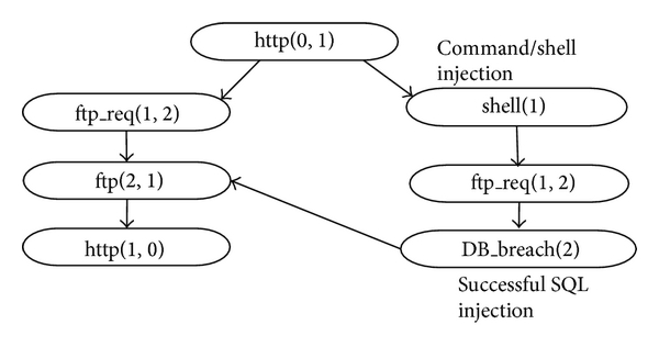 For illustration purposes, we provide an intuitive example of a system and its attack graph. There are machine 0, machine 1, and machine 2, which contain a user’s work station, a web server, and a database server, respectively. The firewall allows http and ssh requests from machine 0 across to machine 1. During the normal operation, the user makes an http request to server 1, which goes through the firewall. Server 1 accesses database server running on server 2 to retrieve the required data and communicates back to machine 0 through http. If the user attempts to access machine 2 directly, then the firewall blocks the communication. This holds true if there is a request such as an ssh request from machine 0 to machine 2, then it is considered an anomalous behavior which is blocked by the firewall. Moreover, the database on server 2 would have private data of users other than the one at machine 0. Instead a command injection attack is successfully launched on server 1 to compromise it. Then with the help of a compromised shell on machine 1, a SQL injection attack is launched on the database at machine 2. This being successful the restricted data is siphoned to server 1 and then to machine 0. This scenario is depicted with the attack graph in Figures 1 and 2.