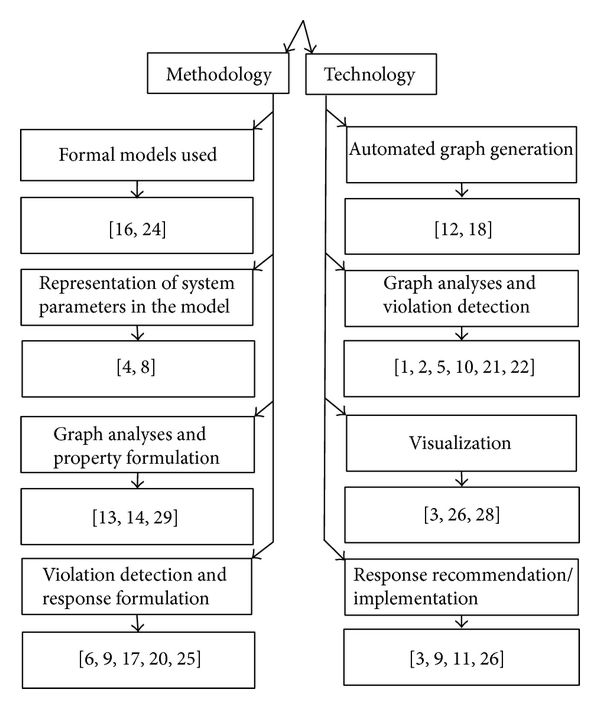 Danforth [22] proposed an efficient rule-based approach for generating attack graphs through aggregating individual attacks into abstract classes, as well as clustering identical machines to reduce visual complexity. Convenient models for threat assessment in networks are proposed based on their efficient approach.(1)The host related information is used to construct the attack graphs.(2)The graphs are constructed and clustering is used to minimize the attack graphs for improved visualization.(3)The graphs are generated using dot from the Graphviz project.(4)Danforth [22] uses the expert system Java Expert System Shell (JESS) to generate the attack graph and dot from the Graphviz project is used for graph visualization.(5)The properties based on the abstract (attack) classes of the networks are being analyzed.(6)Danforth does not provide direct recommendation but provides what-if scenarios relative to mitigation techniques for an administrator to gain insight when potential vulnerabilities are within the system.(7)The method used to evaluate this work involves 986 hosts.Sawilla and Ou [23] proposed AssetRank using dependency graphs representing attacker privileges and vulnerabilities. CVSS parameters from the national vulnerability database (NVD) are used as input into the AssetRank tool. Three experiments are provided using the MulVAL attack-graph tool suite to compute a dependency attack graph. Schuppenies [24] developed both theoretical and technological improvements in Automatic Extraction of Vulnerability Information for Attack Graphs. The work provides a very thorough Bayesian Attack Graph and analysis for dynamic risk management. Cheng et al. [25] proposed a compression technique for representing attack graphs using reference encoding. Simulation is run by first generating a topological graph using BRITE and GT-ITM followed by injecting vulnerability information into the generated graphs. Cheng et al. [25] are able to generate 263 topological graphs with host ranging from 60 to 1023. A Jaccard similarity coefficient is utilized to determine the degree of similarity between vulnerabilities on various hosts. (1)Host connectivity and known vulnerabilities were used as the parameter input to attack graph construction.(2)Attack graphs were used to visualize attack paths.(3)A hierarchical approach was used to generate the attack graph.(4)There were no specific tools highlighted for construction.(5)The properties that are analyzed are the similarity between the hosts to determine if the vulnerabilities on various hosts are similar.(6)No recommendation techniques are used to provide a network administrator information to harden the network.(7)The methods used to evaluate the work involve the simulation of 263 topological graphs with host ranging from 60 to 1023.