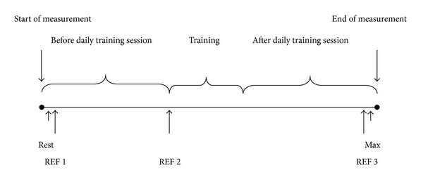 Finally, the RMS for the working periods before (first 60–90 minutes of data sampling) and after the daily training session (last 60–90 minutes) was determined, using the same procedure as described above. This allowed the identification of periods where the EMG amplitude was below a predefined percentage of the normalized EMGmax, which was termed an EMGgap. In this study, the following percentages of the normalized EMGmax had a particular interest: 0.5%, 1.0%, 1.5%, and 2% EMGmax. According to previous studies, 0.5% EMGmax represents the boundary for total relaxation of a motor unit, whereas the remaining values represent different degrees of activation of the smallest motor units [41]. However, all periods with a very low level of muscle activity up to 2% of maximal EMG had a particular interest. In order to be classified as an EMGgap, the EMG amplitude additionally had to be below 0.5% EMGmax for a period of at least 0.2 s [44, 45].