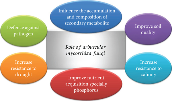 After insertion of hyphae in root cortical region, AMF starts arbuscule formation, vesicle development (site of food storage), and hyphal growth colonizing the whole cortical region of 80% of the plant species except some of the vascular plant species belonging to plant families, viz., Juncaceae, Caryophyllaceae, Chenopodiaceae, Cruciferae, Cyperaceae, and Chenopodiaceae, which can not form mycorrhizae association. Genus Glomus (recently known Funneliformis) is the largest genera of AM fungi including important species, namely, Funneliformis mosseae, F. etunicatum, F. viscosum, F. claroideum, and F. fasciculatum [5]. Among these species, the oldest and most widely used Rhizophagus irregularis previously known as Glomus intraradices (Glomeromycota) is considered as the prime AMF and has been found in temperate and tropical regions of the world [6]. AMF symbiosis also proved as stress-mitigating agent and provides tolerant to plant against drought, salinity, and heavy metal, and the host plant’s cability to combat biotic stresses is strengthened (Figure 1). Apart from said benefits, AMF also has some nonnutritive impact in improving soil texture [7].