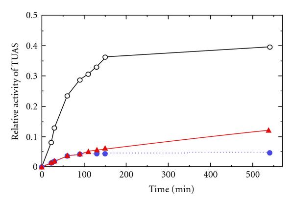 To determine the TUAS activity in the different subcellular compartments, a specific experiment was conducted in which crude cell extract was prepared by physically grinding cells with alumina instead of lysozyme digestion [5]. Thus four fractions were obtained including (1) cytosol, (2) cytoplasmic membrane, (3) the cell wall, and (4) the culture supernatant or extracellular cell filtrate. The protein concentration in each fraction was standardized to 1 g/ml before the TUAS assay.