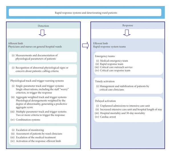 On general hospital wards, the timely treatment of patient deterioration before the onset of serious adverse events (SAEs) is achievable by alerting emergency teams of critical care clinicians. The Medical Emergency Team (MET) has been adopted, the first of these teams, in 1989 at the Liverpool Hospital in Sydney, Australia [1, 2], to supplement or replace the Cardiac Arrest Team (CAT) [3]. Afterward, the Rapid Response Team (RRT) in the United States of America (USA), the Critical Care Outreach Service (CCOS) in the United Kingdom (UK), and the Critical Care Response Team (CCRT) in Canada [4–7] have been proposed. In 2006, the concept of the Rapid Response System (RRS) has merged the previous models of emergency teams by integrating four components [8, 9]. The afferent limb includes ward physicians and nurses to identify at-risk patients and to trigger a response based on the calling criteria. The efferent limb ensures the response with emergency teams of critical care doctors and nurses. The last two are the administrative limb, for coordinating all system components, and the quality improvement limb, for improving the function of the RRS [8, 9]. The calling criteria include vital signs, physiological parameters, and the level of consciousness, the objective criteria, and the staff “worried” criterion or concern about the patient, the subjective criterion. These tools are named the physiological track and trigger warning systems (TTSs) and consist of single-parameter systems, multiple-parameter systems, aggregate weighted scoring systems, and combination systems [10, 11].