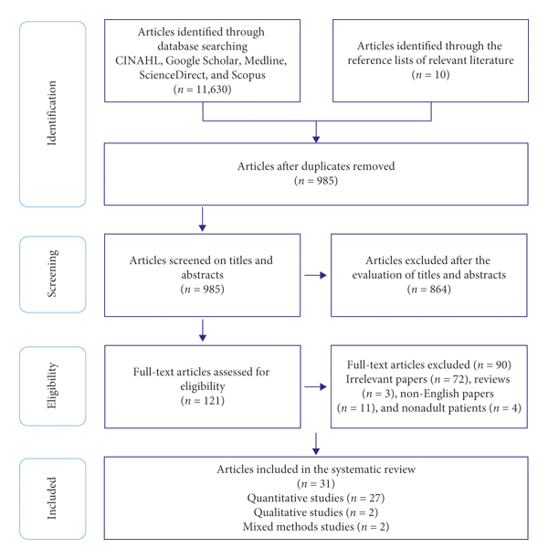 The search from all sources generated 11,640 articles. The removal of duplicates and nonrelevant papers produced 121 potential studies. Following a full-text review, 31 articles were included (Figure 2).