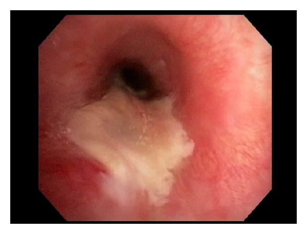 After routine intravenous sedation with Midazolam and Fentanyl, an epidural was placed at the T6-7 vertebral interspace. Patient was returned to the supine position where general anesthesia was induced intravenously with fentanyl, lidocaine, propofol, and succinylcholine. Her airway was secured via direct laryngoscopy (grade one view) and placement of a styleted 35-French left double lumen endotracheal tube without difficulty. Once the tracheal cuff had passed through the cords, the stylette was removed and bilateral breath sounds were confirmed. Proper placement of the bronchial lumen of the tube in the left main bronchus was confirmed with fiberoptic bronchoscopy. The patient was placed in lateral position for her surgical procedure, and proper placement of the DLT was once again confirmed with the fiberoptic bronchoscope. No blood or signs of bronchial or tracheal trauma were observed.