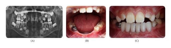 When the patient was discharged from the hospital after five months, clinical and radiographical examination of the patient was performed in the Faculty of Dentistry, and it was reported that he also extracted teeth 42 and 83 after the last dental examination in the hospital (Figure 1(C)). There were also dental caries in the maxillary and mandibular primary molars. The mandibular right primary first molar was pulpatomized and restored with a stainless steel crown and the remaining primary molars were replaced with compomer restorations. After completion of all of the necessary treatments of the teeth, a partial removable denture was prepared for aesthetic and functional requirements (Figure 2). Follow-up evaluations of the patient continue periodically.