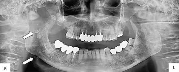 Calcifications in the soft tissues of the maxillofacial region may present as sialoliths, phleboliths, calcified epitheliomas, or lymph node calcifications. Phleboliths are found in venous malformations and are thought to be caused by the calcification of intravenous thrombi [1, 2]. In this report, we describe a case in which numerous phleboliths were diagnosed in relation to the right mandible.