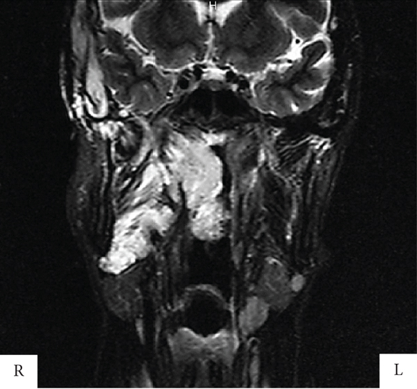 There was an extensive high-intensity signal on the medial aspect of the right side of the face in the STIR image. Computed tomography clearly differentiated the inferior margin of the right mandible from the submandibular gland, and numerous calcifications were observed. Sialoliths were excluded due to the absence of pain associated with the salivary glands. However, a definitive diagnosis of multiple phleboliths could not be made, as they were not removed, and a biopsy was not performed.