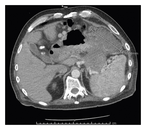 In this case report, we discuss a 54-year-old male with no relevant medical history who initially presented with abdominal pain and melena. Vital signs were stable, although hemoglobin dropped to a nadir of 5.3 g/dL. After transfusion, he underwent an EGD, which showed a large submucosal, noncircumferential mass without active bleeding in the cardia. Biopsies were taken at this time, although they were inconclusive based on the pathology review. Given the appearance of the mass, a gastric tumor/cancer was suspected. Initial CT imaging showed a large complex gastric mass extending both posterior and anterior to the gastric lumen, including a greater than 6 cm component extending posteriorly and contiguous with the distal body and tail and a greater than 10 cm component extending anteriorly contiguous with the splenic flexure colon (Figures 1–3). No cirrhotic liver changes were seen. Subsequent EUS showed type 1 isolated gastric varices in the fundus and a large intraabdominal fluid collection likely representing bleeding from collaterals, given continuity with adjacent prominent collaterals (Figures 4 and 5). Numerous collateral vessels were noted in the perigastric and perisplenic regions. The apparent etiology was SVT seen on contrast-enhanced imaging, although the patient did not have a documented history of pancreatitis or coagulopathy. IR was consulted for further management of the hematoma and SVT. Due to the location of the hematoma, we chose a conservative approach, and the patient remained stable until discharge without requiring further blood transfusions. In addition, in this case, the risks of anticoagulation outweighed the benefits.