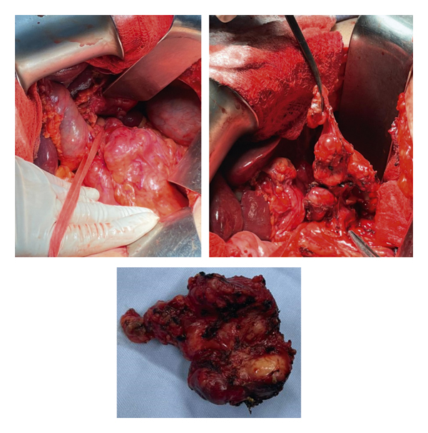 At this time, one year after the hepatectomy, a multidisciplinary meeting was held and decision was taken to proceed with debulking surgery. Excision of the left para-aortic, celiac, and gastrohepatic lymph nodes was done (Figure 8). The final pathology result was consistent with multiple metastasis of the known neuroendocrine tumor; gastrohepatic lymph node 1+/2, left para-aortic 4+/6, hepatic hilium 3+/5, and celiac lymph nodes 2+/2.