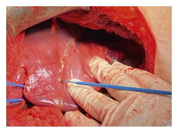Decision was made to proceed with surgical management. Access to the abdomen was done through a right subcostal incision, left liver mass was identified very adherent to the lesser omentum, and delicate adhesiolysis was done till the identification of a large lymph node at the level of the porta hepatis and common hepatic artery (Figure 2). Delicate and complete dissection of the lymph nodes en bloc that was abutting the common hepatic artery was done. Then, a cholecystectomy and mobilization of the left liver was done by dissecting all its attachments. Common bile duct, right and left ducts, common hepatic artery, right and left, and the portal vein, right and left, were all identified and isolated using vessel loops (Figure 3). Selective clamping of the left lobe was done by controlling the left hepatic artery and left portal vein using bulldogs. The demarcation line between the right and left lobes was seen (Figure 4). The line was marked on the liver using electrocautery. Dissection started caudally to cranially using Kelly and bipolar. All further ligation and divisions were done under vision (site of entrance to the left lobe) (Figure 5). The left hepatic artery, left portal vein, and left bile duct were all ligated and divided. The middle hepatic vein was identified and preserved. After full dissection of the left liver lobe, control of the left hepatic vein was done using GIA purple, and the resected specime was removed (Figure 6). Additional hemostasis was done by placement of surgical. A lamellated drain was left at the surgical bed. Surgery time was 5 hours, blood loss 300 cc, and no pringle maneuver was used. Final histopathology result and immunohistochemical study confirmed the diagnosis of a well-differentiated neuroendocrine tumor of the liver, classified as grade 2. The tumoral cells expressed CD 56, chromogranin, and synaptophysin in an intense and diffuse manner. Proliferation index ki67% is estimated around 8%. The pathology result confirmed the presence of an intact capsule, negative resections margins, and presence of vascular and perineural invasion with 4 positive lymph nodes metastasis over 4 resected.