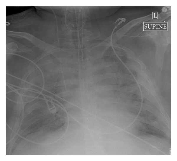 Our patient was a 53-year old previously healthy, nonsmoker with no reported unusual recent exposures, male who presented to an outside hospital with severe respiratory distress. He was started on empiric broad-spectrum antibiotics and oseltamivir phosphate (150 mg PO BID, Tamiflu, Genentech, Inc., San Francisco, Calif, USA) and Methylprednisolone (60 mg intravenous, Q6H for 3 days). Initial bacterial blood and respiratory cultures were negative, but had a positive nasal swab for Influenza H1N1. Initial chest X-ray showed severe diffuse pulmonary infiltrates and edema consistent with adult respiratory distress syndrome (ARDS, Figure 1). Five days later, due to failure of maximal mechanical ventilation and worsening hypoxemia with hypercarbia he was placed on percutaneous veno-veno ECMO and transferred to our Institution. Upon arrival, bacterial and fungal blood, urine, and respiratory cultures from a bronchial alveolar lavage were obtained and were negative. Real-time polymerase chain reaction assay was positive for H1N1-2009. Other viral cultures, including HIV-1/-2 and a hepatitis panel, were negative. A transthoracic echocardiogram was unremarkable. Over several days, antibiotic therapy was deescalated, and he completed a 10-day course of oseltamivir.