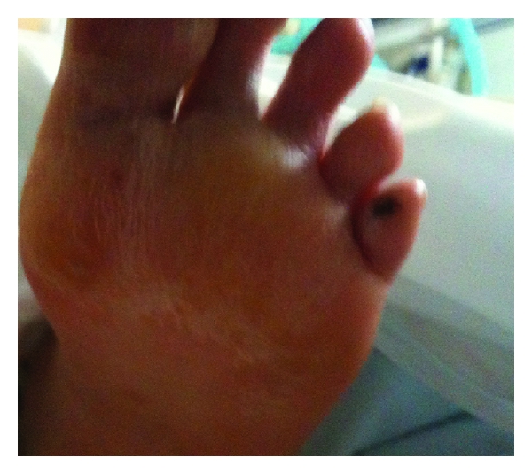 Physical exam revealed thin-built chronically ill-appearing lady. Oral temperature was 36.5°C, heart rate was 87/min, blood pressure was 117/59, respiratory rate was 17/min, and oxygen saturation was 99% on 2 L of oxygen. She had left shoulder tenderness and limited range of motion, tenderness on the cervical and lumbar spine, weakness in the lower extremities, and bilateral flank pain. No bruits were detected on cardiac exam. Lungs were clear bilaterally. Lesions were noted on palms and soles (Figure 1). The rest of the examination was normal.