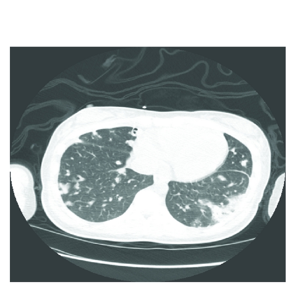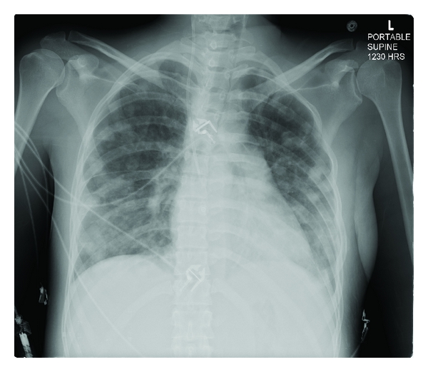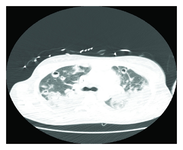 The patient was started on daptomycin (6 mg/kg IV daily) since vancomycin was avoided due to the presence of acute renal injury. On day 4, chest tomography showed progression in the number and size of cavitary lesions (Figure 4). She remained hemodynamically stable with overall improved respiratory status including decreasing oxygen requirements of 2 liters and was transferred to a general medical floor on day number 7; daptomycin was continued as the sole antimicrobial. On day 11, the patient became febrile and chest X-ray showed diffuse airspace disease and cavitary lesions (Figure 5). Daptomycin was switched to ceftaroline (600 mg IV twice daily). On day 17, repeat tomography showed decrease in size of multiple cavitary and noncavitary nodules with patchy airspace disease. The patient was discharged to rehabilitation center; there was resolution of infection at 6 weeks.