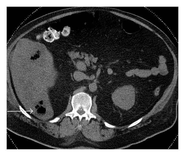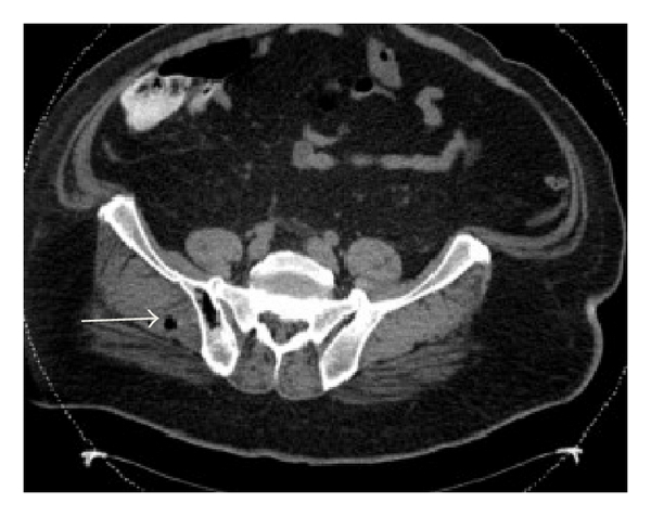 A 54-year-old male with a past medical history of hypertension presented with a ten-day history of severe bilateral lower abdominal pain radiating to his back. He reported a twenty-pound weight loss over the past six months. Upon presentation, he was afebrile and his vital signs were stable. On exam, the abdomen was diffusely tender to palpation and bowel sounds were normal with no peritoneal signs. A CT abdomen/pelvis showed multiple hepatic and ascending colonic lesions, with pericolonic fat infiltration and periportal lymphadenopathy. On day two of admission, an ultrasound guided liver biopsy was performed and pathology showed metastatic adenocarcinoma consistent with primary colonic malignancy. Patient underwent staging with a chest CT, which was negative for metastatic disease. On day three of admission, the patient became hypotensive with a blood pressure (BP) of 105/62 mmHg which was thought to be secondary to pain medications and responded well to fluid resuscitation. Subsequently, patient’s lab values revealed an elevated creatinine (Cr) of 2.6 mg/dL, which was believed to be due to acute tubular necrosis secondary to hypotensive episodes. On day five of admission, the patient was persistently hypotensive with a BP of 100/60 mmHg, which did not respond to intravenous (IV) fluid resuscitation, and he was transferred to the intensive care unit to initiate therapy with vasopressors. Peripheral blood cultures were drawn, and the patient was empirically started on IV piperacillin/tazobactam 3.375 g every 6 hours and metronidazole 500 mg every 8 hours as per Infectious Disease recommendations. His lab values revealed leukocytosis of 16.4 K/μL, creatinine of 4.1 mg/dL, total bilirubin of 3.3 mg/dL, AST of 407 U/L, ALT of 90 U/L, alkaline phosphatase of 259 U/L, and lactic acid of 4.1 mmom/L. Final blood cultures were positive for C. septicum; no anaerobic susceptibilities are performed at our hospital. The patient was continued on the initial broad-spectrum antibiotic regimen of IV piperacillin/tazobactam and metronidazole for a planned 14-day treatment. Repeat CT of abdomen/pelvis showed gas collections in the liver, peritoneum (Figures 1 and 2), multiple soft tissue, and bone (Figures 3 and 4), areas suggestive of clostridial gas gangrene. Lab work indicated worsening liver and kidney functions and the patient developed multiorgan failure. Upon discussion with the patient’s family, the decision was made for comfort measures only. The patient expired on hospital day 13.