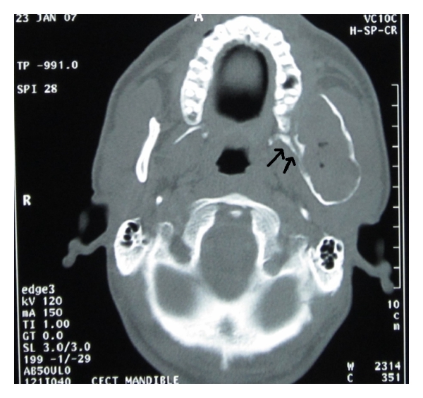 Ameloblastoma is an uncommon epithelial odontogenic neoplasm that is nonmineralized, locally aggressive, and, in most cases, benign. Ameloblastoma accounts for approximately 10% of all tumors that originate in the maxilla and mandible [1]. The suggested aetiology of ameloblastoma is that it either arises from the dental lamina or more probably, it arises from basal cells of the oral epithelium or from cells that have undergone differentiation to mimic the ameloblast [2]. Most ameloblastomas develop in the molar-ramus region of the mandible with 70% of them arising in the molar-ramus area and they are occasionally associated with unerupted third molar teeth. The chief histopathological variants of ameloblastoma are the follicular and plexiform types, followed by the acanthomatous and granular cell types. Uncommon variants include desmoplastic, basal cell, clear cell ameloblastoma, keratoameloblastoma, and papilliferous ameloblastoma. It is well known that ameloblastoma can be radiologically unilocular or multilocular radiolucency with a honeycomb or soap bubble appearance [3]. The purpose of reporting this case is to bring to light the CT findings that seem to be unusual. This case is being sent forwards after the prior approval of the Institutional Review Board.